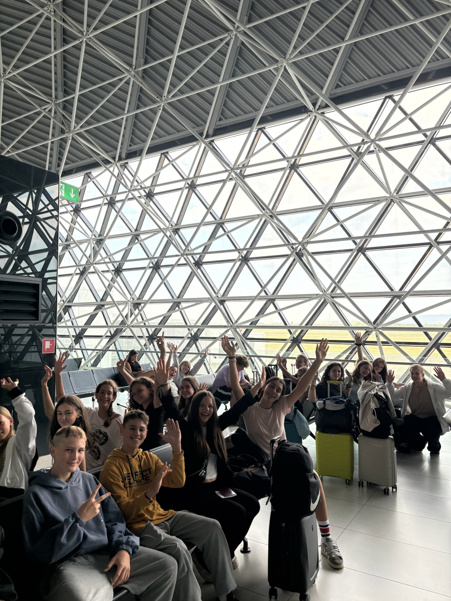 Letos se je skupini popotnikov pridružilo tudi nekaj plesalcev hip hopa in prijetna druščina je pot do letališča preživela v izmenjavanju prigod minulih poletnih tednov. Nekaj utrujenih očk je sicer res omagalo, večino pa je vznemirjenje obdržalo budne. Varno in hitro smo dospeli do letališča, pot je bila zaradi zgodnje ure povsem tekoča.